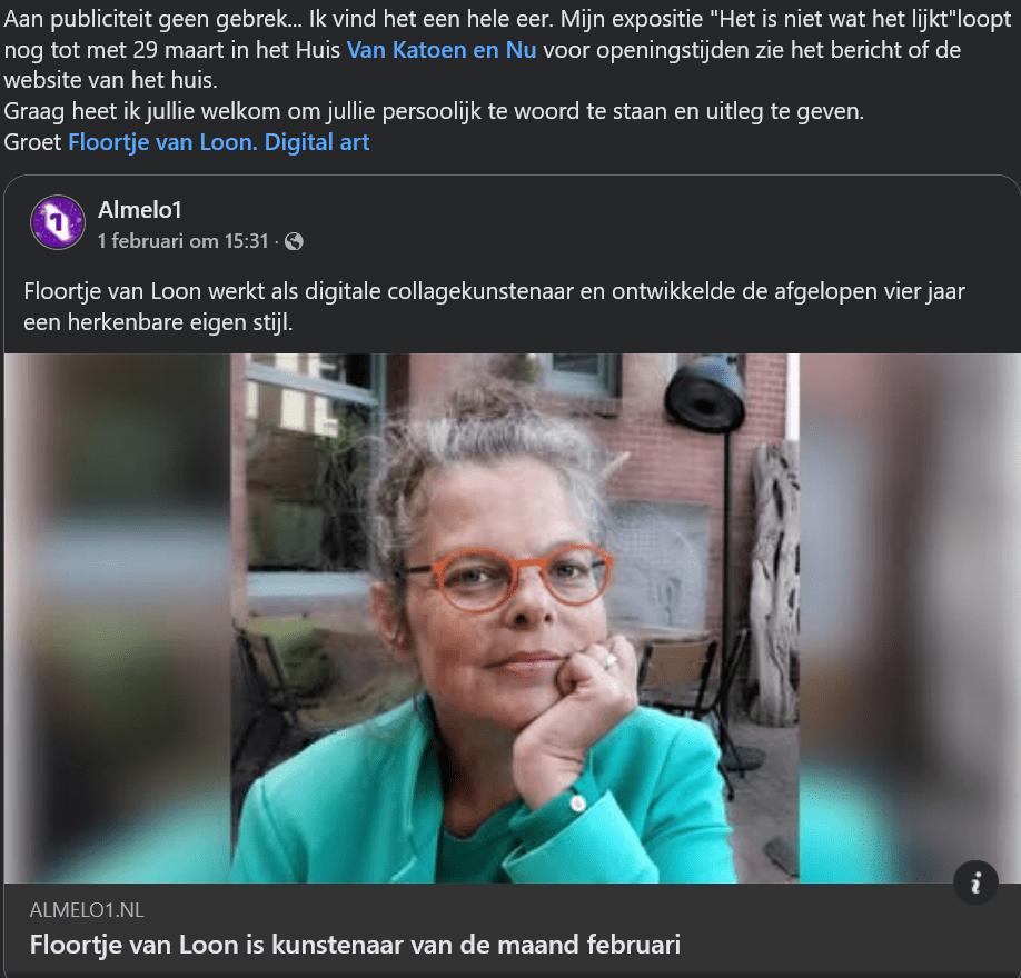 Ik ben Floortje, kunstenaar uit Almelo. Mijn digitale collages zijn kleurrijk, speels en vol fantasie.